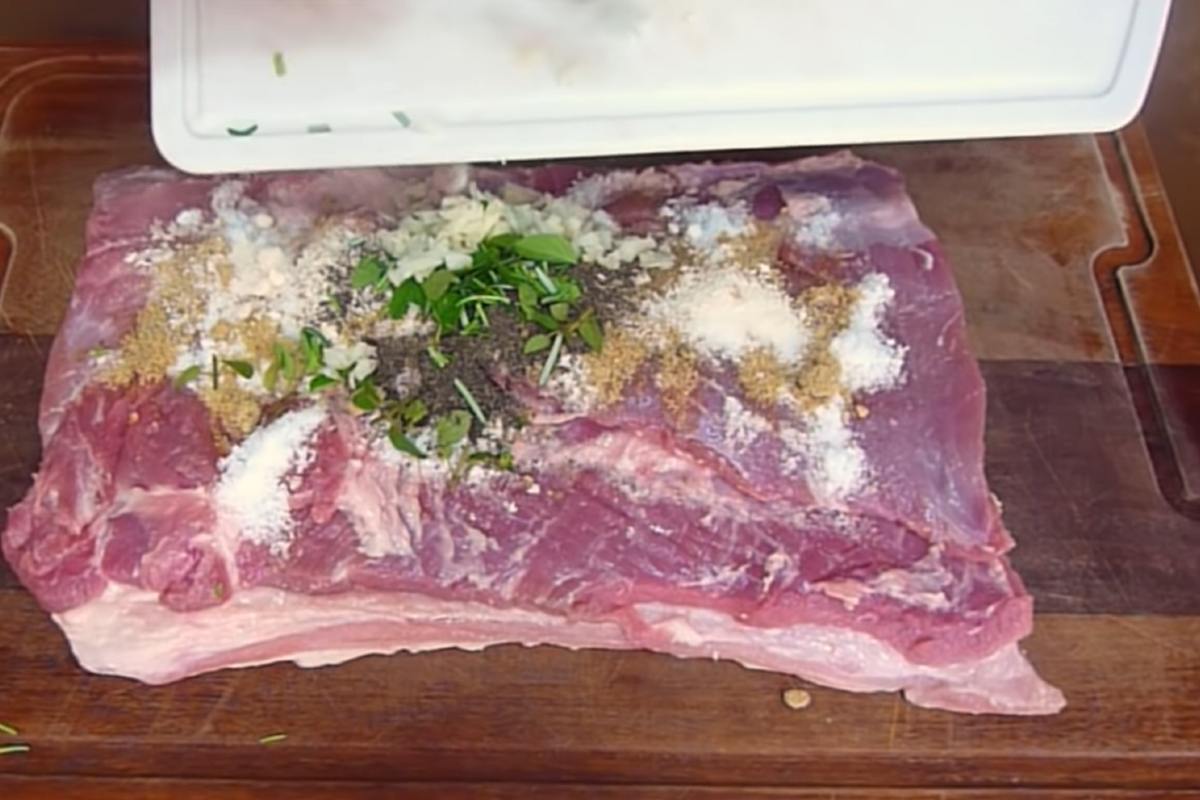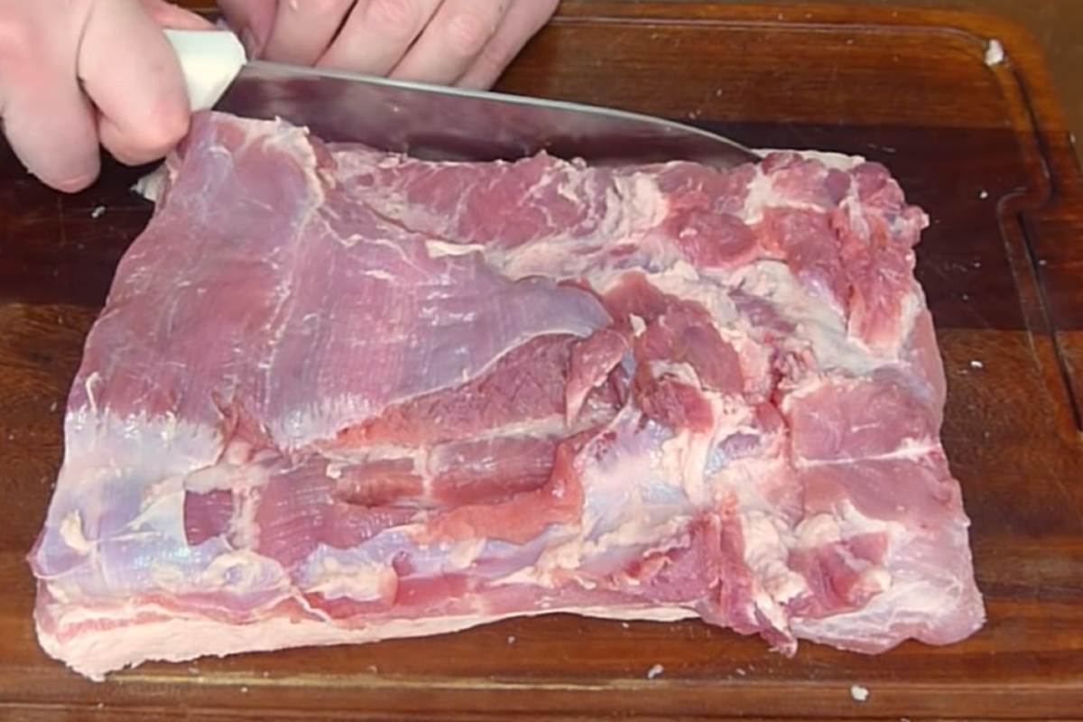 Spălați și uscați pieptul de porc, îndepărtați oasele și tendoanele, și tăiați cu grijă pielea pentru a nu deteriora stratul de grăsime. Tăiați marginile pentru a-i da o formă dreptunghiulară.