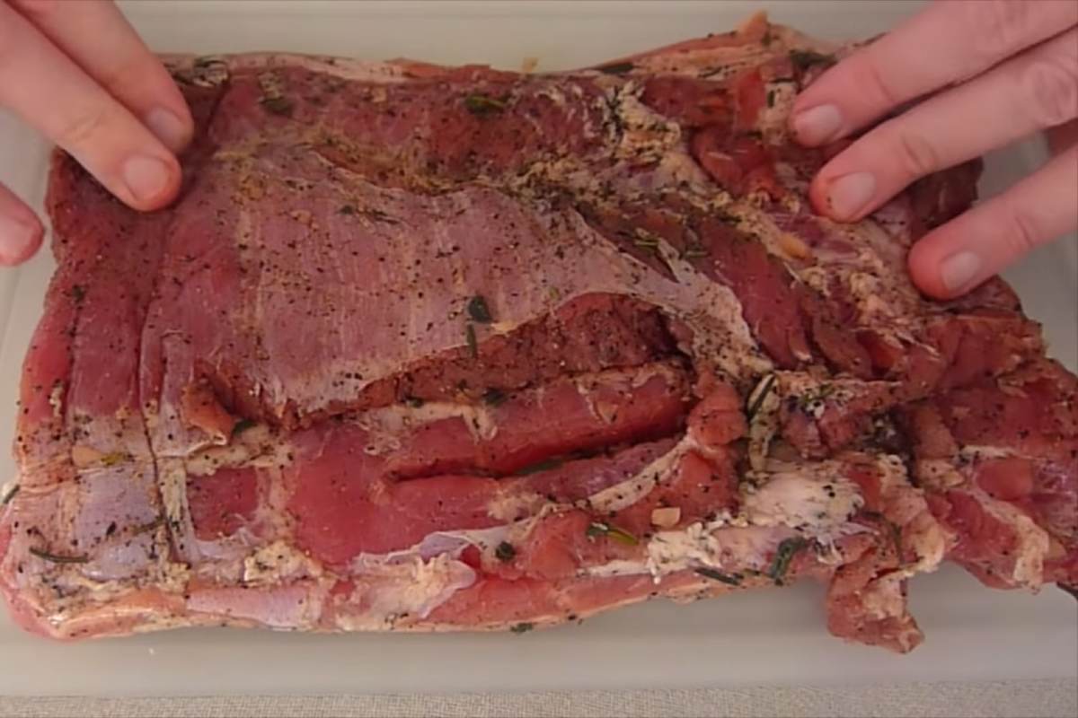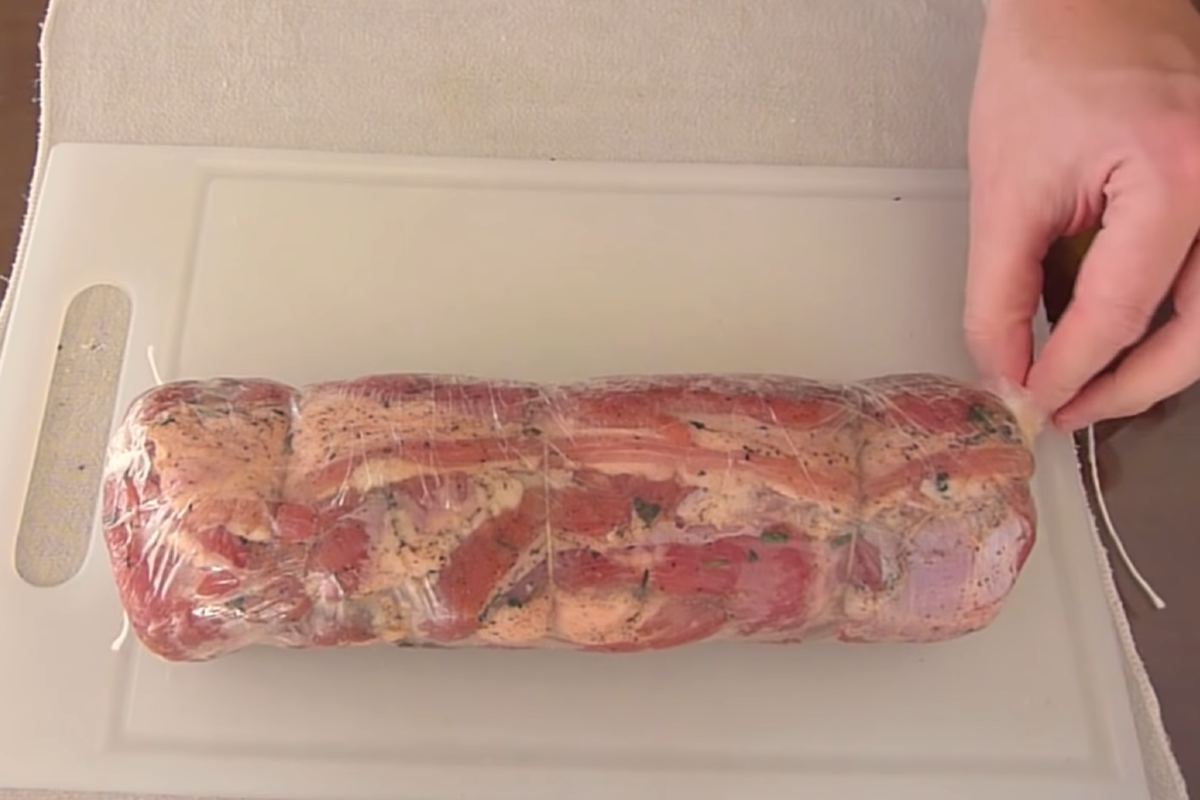 Înfășurați din nou bucata de carne într-un rulou strâns, astfel încât stratul de grăsime exterior să fie la interior. Asigurați ruloul cu ață. Împachetați-l strâns în folie alimentară, scoateți aerul și legați marginile.
