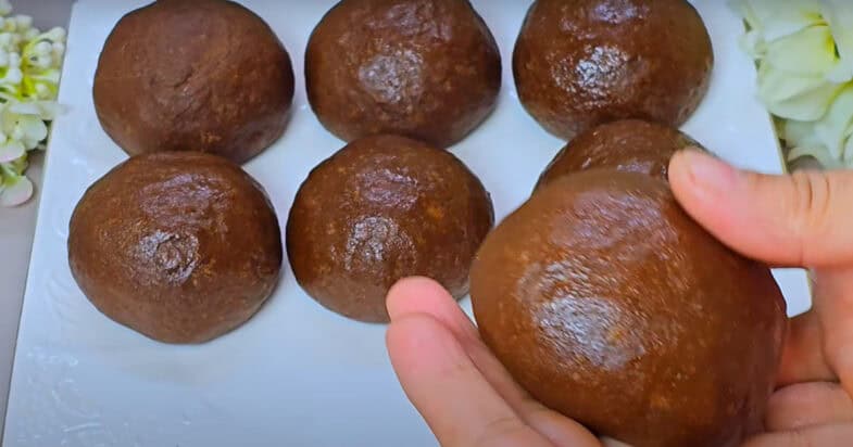 4. Adaug făina și cacaoa și frământ aluatul. Împart aluatul în 7 părți egale, formez bile pe care le acopăr cu folie alimentară pentru a nu se usca.