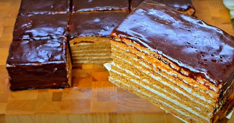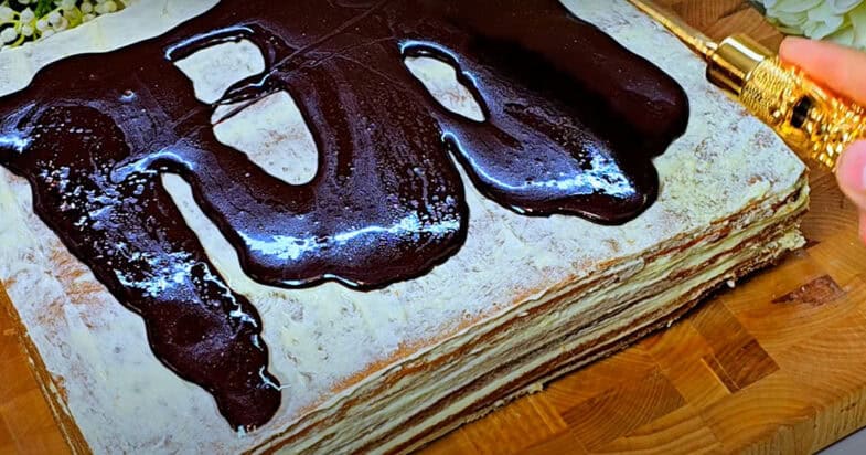 1. Unge fiecare blat cu cremă, iar la final, toarnă ciocolată topită deasupra tortului pentru decor.