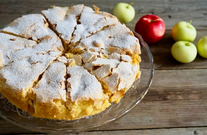 4.Așezăm merele peste aluat iar pe deasupra adăugăm aluatul rămas.