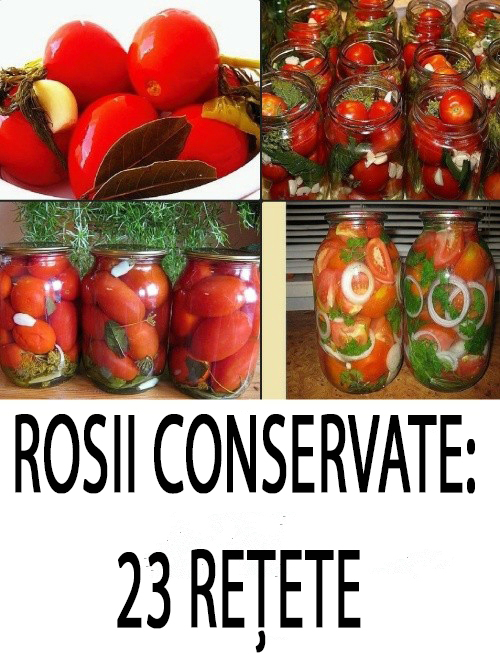 Ingrediente: 5 kg roșii, 60 g mărar verde, 25 g frunze de hrean, 2-3 căței de usturoi, 25 g pătrunjel verde, 2 lingurițe frunze tocate de mentă, 2 foi de dafin, 1 linguriță de ardei iute roșu, 3 boabe de piper negru.