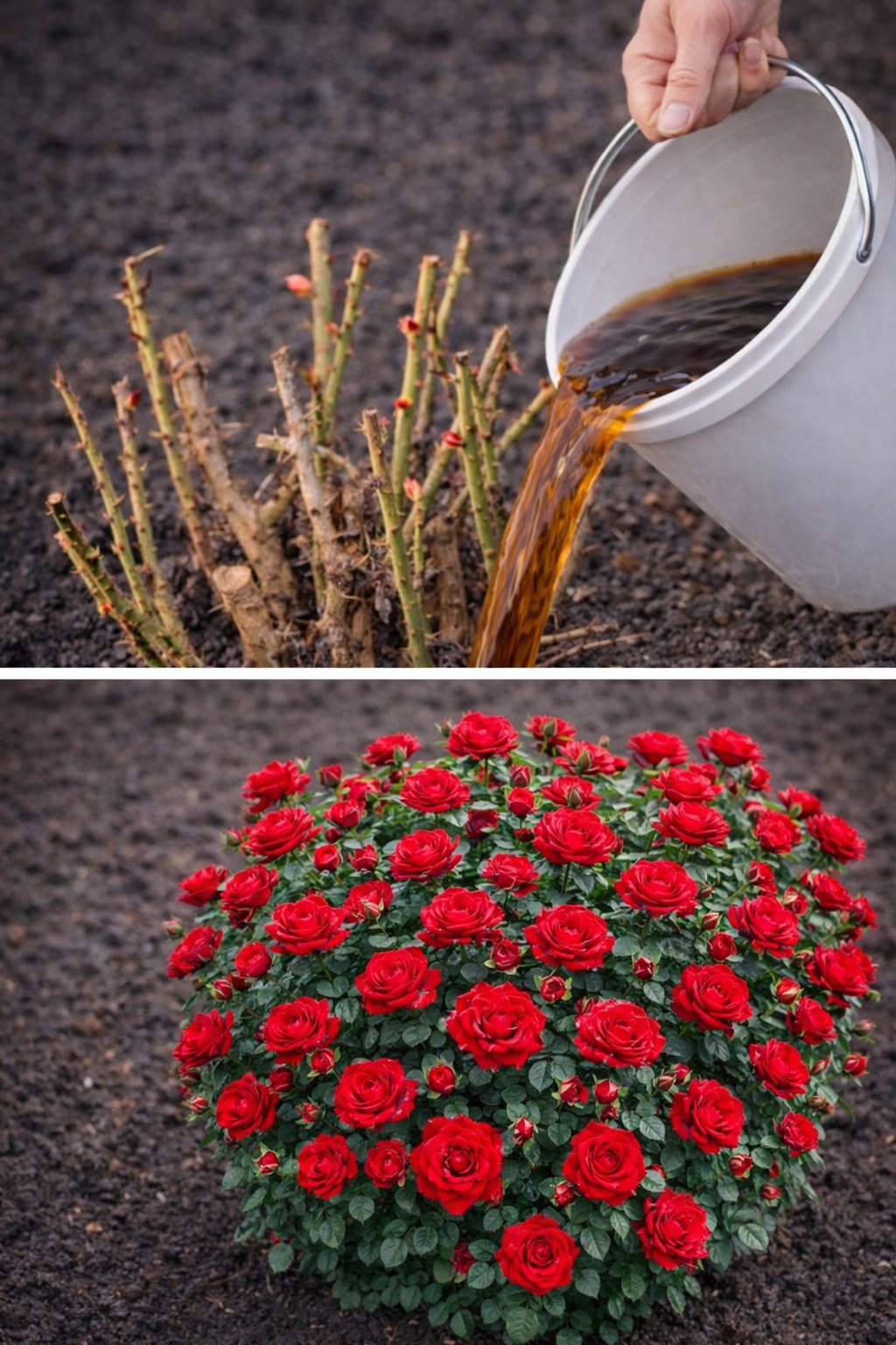 Dizolvă îngrășământul în apă și udă tufele. Această fertilizare ajută trandafirii să se refacă mai repede după iarnă și să pornească activ în vegetație.