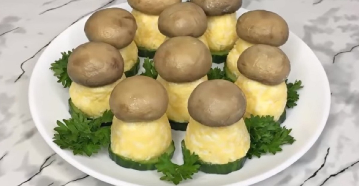 Este servită sub formă de mici ciupercuțe porționate, având un aspect original și apetisant. Piciorușele ciupercilor sunt realizate dintr-o pastă moale de cartofi și brânză, iar pălăriile sunt din ciuperci champignon marinate. Componentele se completează perfect, rezultând un preparat foarte gustos.