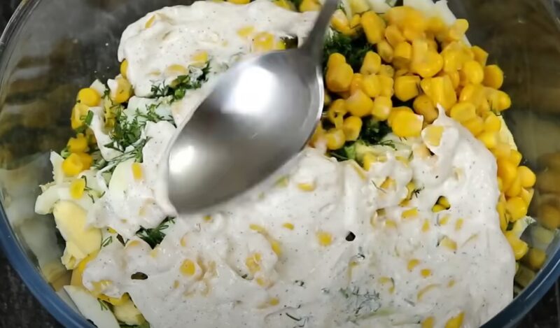 Tocăm mărarul și îl adăugăm în salată împreună cu porumbul conservat. Pentru dressing, amestecăm smântâna cu usturoiul pisat, sare și piper.