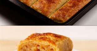 Acest plăcintă, pe care am învățat să o fac de la mama mea, are o rețetă foarte veche. Deoarece ea este acum bătrână (este în viață și sănătoasă, în curând va împlini 83 de ani), nu mai frământă singură aluatul, ci de obicei mă roagă pe mine să fac asta pentru ea duminica… Este foarte gustos!