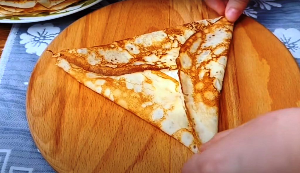 - Într-un bol, punem brânza de vaci, adăugăm smântână și cele 3 linguri de zahăr. Amestecăm ingredientele și le punem în centrul fiecărei clătite. Împăturim umplutura într-un triunghi și repetăm aceleași acțiuni cu restul clătitelor.