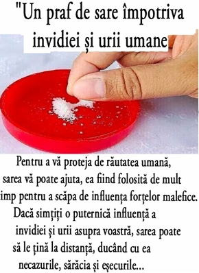 „O pincătură de sare împotriva invidiei și urii umane. Această practică ajută foarte bine să scapi de tot ce ți-a fost trimis în adresa ta, de ceea ce te-a afectat, să îndepărtezi problemele, sărăcia și eșecurile. Dacă deja s-a întâmplat, aceasta te va ajuta să-ți pui o bună protecție. Trebuie …