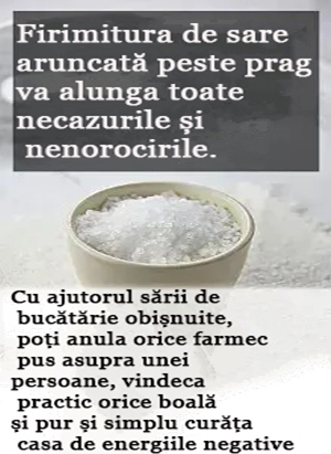 Citiți mai multe »Aruncarea unei mîni de sare peste pragul ușii va alunga toate neplăcerile și nenorocirile din casa ta.