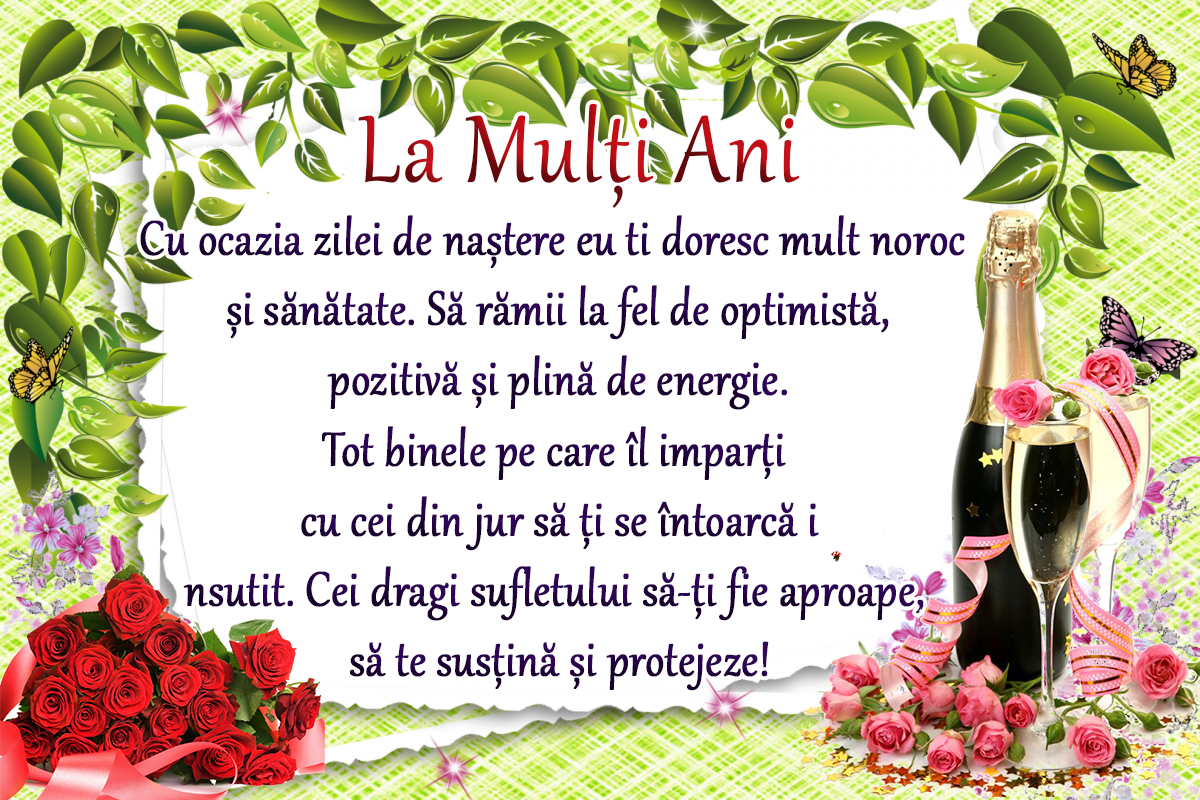 „De ziua ta” Sa-ti fie viata un lung sir de intamplari fericite, sa te bucuri de sanatate si de tot ce este mai frumos pe lume! LA MULTI ANI! Te felicit cu prilejul zilei tale de naștere! Îți doresc să ai în viață un milion de emoții frumoase, culori aprinse …