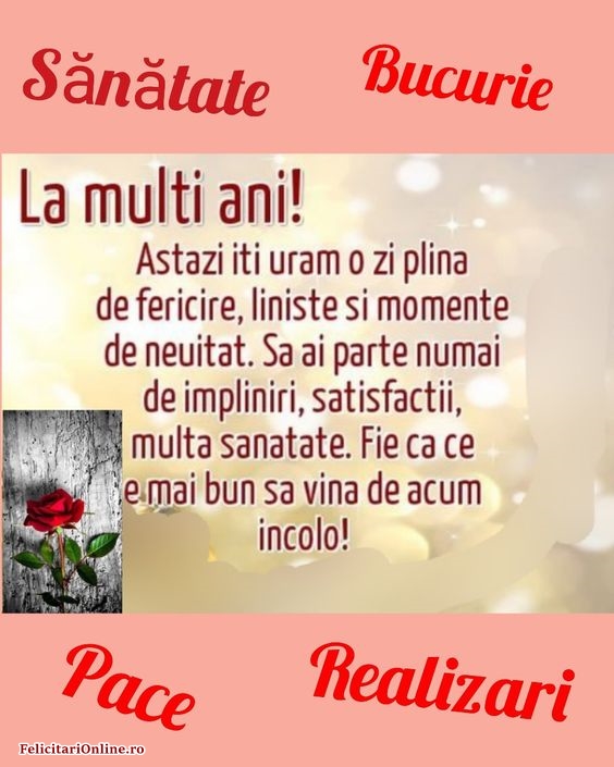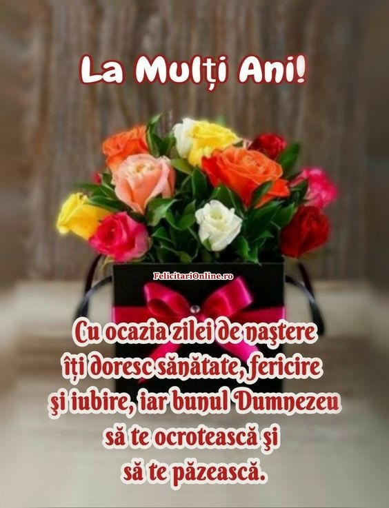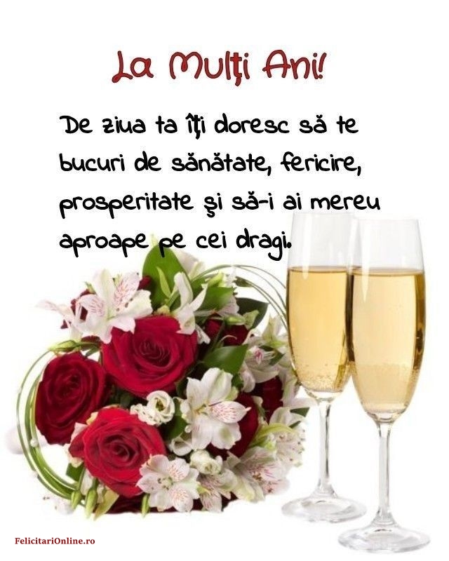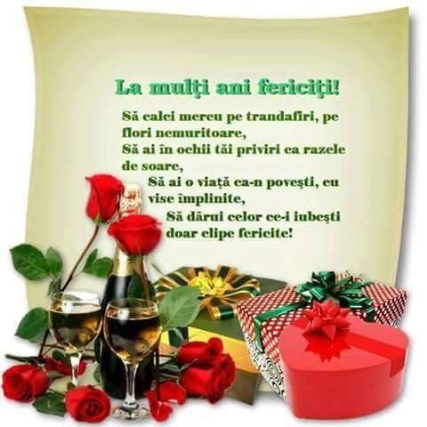 Te felicit cu prilejul zilei tale de naștere! Îți doresc pace și lumină în suflet, putere în corp, căldură în casă, seninătate în gânduri, succese în activitățile tale! Fie ca toate visele tale să se îndeplinească cu o viteză nemaiîntâlnită. La mulți ani!