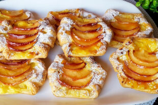 Ingrediente: 1 ou 3 linguri de zahăr 2 linguri de amidon de porumb 8 g zahăr vanilat 300 ml lapte 1 linguriță de unt Aluat fraged 1 măr Sucul de la jumătate de lămâie 1 lingură de gem de caise Zahăr pudră Preparare: Într-o cratiță, adaug oul, zahărul, amidonul …