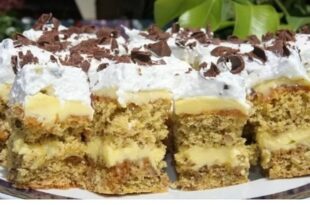 Rețetă: Prăjitură cu blat de nuci, cremă de unt și caramel, și glazură de bezea Ingrediente: Blat: 7 ouă 7 linguri zahăr 7 linguri făină 7 linguri nuci măcinate 1 plic praf de copt Cremă: 3 gălbenușuri 200 g zahăr 1 plic zahăr vanilat 300 ml lapte 3 linguri …