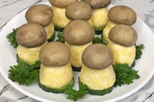 Această gustare este o reinterpretare a salatei „Poiana cu ciuperci”. Este servită sub formă de mici ciupercuțe porționate, având un aspect original și apetisant. Piciorușele ciupercilor sunt realizate dintr-o pastă moale de cartofi și brânză, iar pălăriile sunt din ciuperci champignon marinate. Componentele se completează perfect, rezultând un preparat …