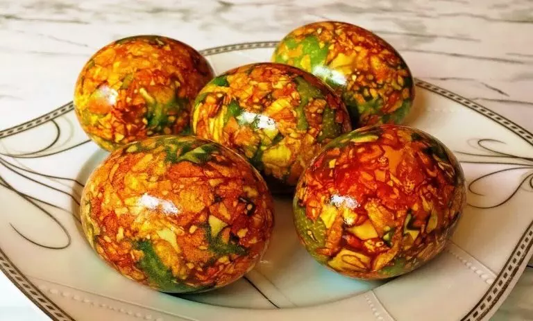 Lăsați ouăle să se răcească în apă aproximativ o oră. După aceea, clătiți-le cu grijă sub apă rece, îndepărtați tifonul și ștergeți-le ușor.