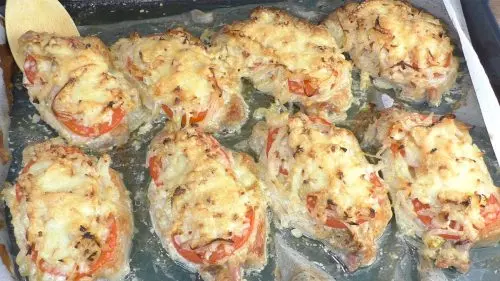 Distribuim uniform roșiile și ceapa pe fiecare bucată de carne, ceea ce va conferi o suculență și frăgezime aparte preparatului.