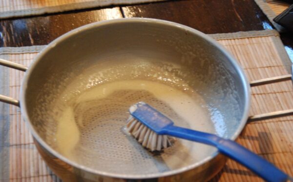 Aplicați amestecul pe tigaie și lăsați-l timp de 10 minute. Apoi, frecați suprafața cu o perie dură până devine complet curată, iar la final clătiți cu apă.4