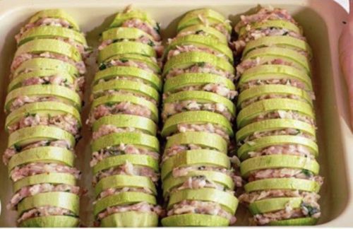 - Așezați dovleceii într-o formă de copt, alternându-i cu straturi de carne tocată.