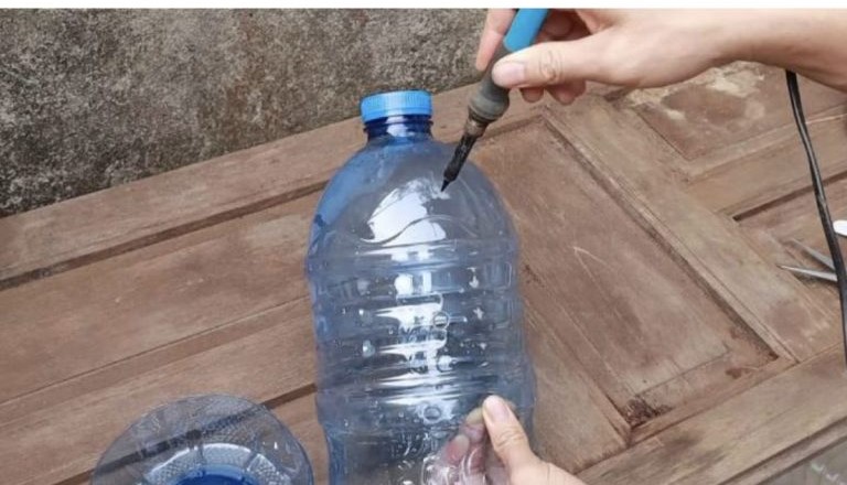 Ia o sticlă de plastic curată și fă găuri în ea la distanță de 10 cm una de alta, folosind un pistol de lipit sau un cui înfierbântat. Acestea vor fi punctele de creștere pentru ciuperci. Taie fundul sticlei.