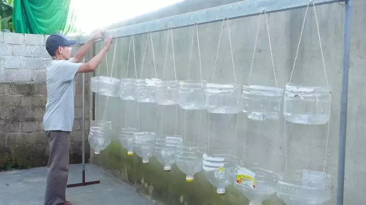 Luați sticle mari de plastic de cel puțin 5 litri, tăiați-le pe jumătate. Faceți găuri pe fund și pe laturi, treceți prin ele sfori și agățați-le. Astfel, vor ocupa foarte puțin spațiu.