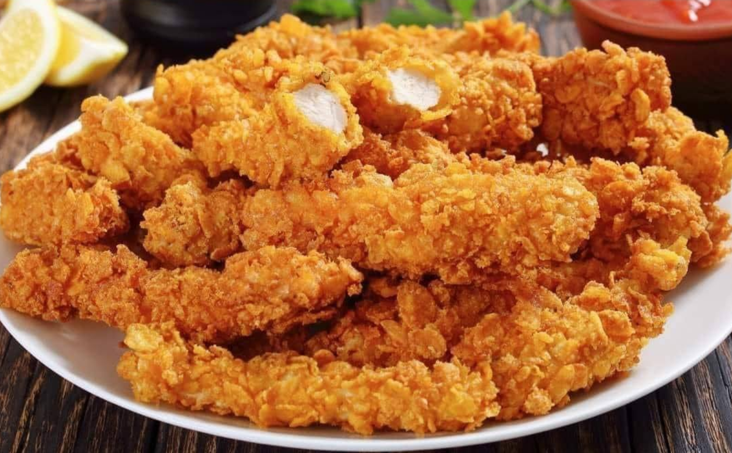 - Scufundați fâșiile în ou bătut, apoi în fulgii de porumb zdrobiți puțin cu mâinile.