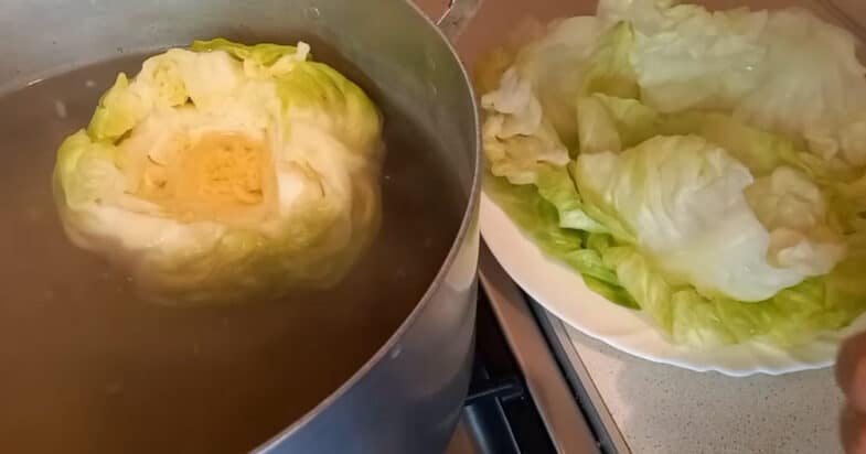 - Într-o oală mare cu apă clocotită, adăugați o lingură de sare. Puneți varza întreagă în oală.