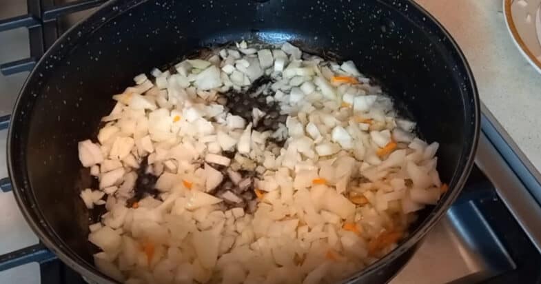 - Încingeți uleiul într-o tigaie. Adăugați ceapa tocată mărunt și prăjiți până devine aurie.