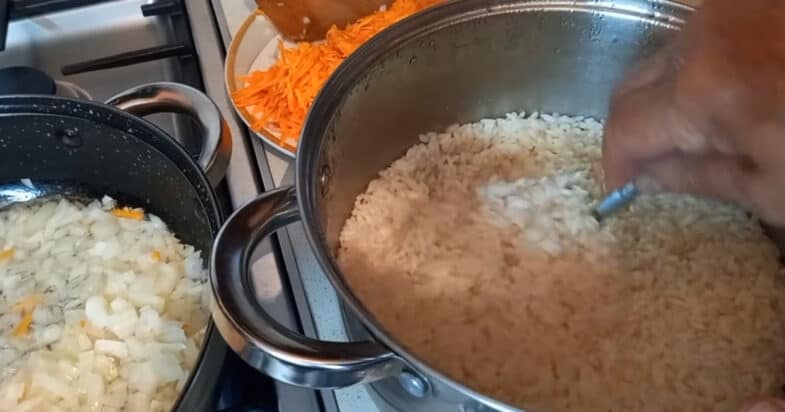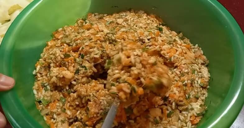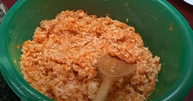 - Într-un castron mare, combinați orezul, carnea tocată, slănina și legumele călite (ceapa și morcovul).