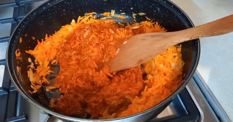 - Radeți morcovul pe răzătoare și adăugați-l peste ceapa prăjită. Continuați să prăjiți până capătă o ușoară nuanță aurie.