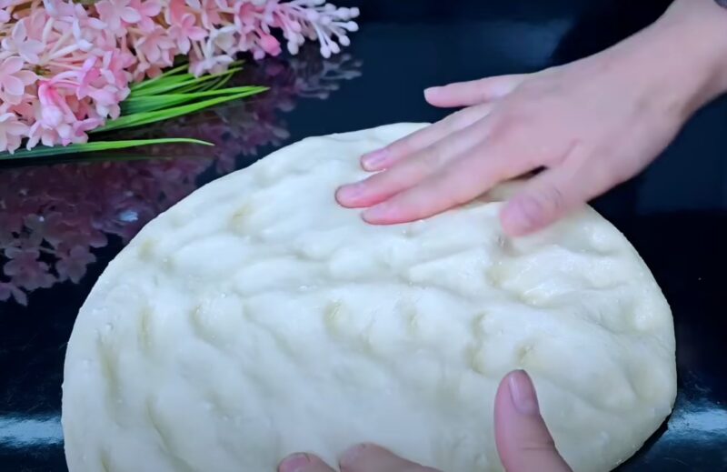 Lăsăm aluatul să se odihnească timp de 20 de minute, acoperit cu folie de plastic și un prosop. Apoi îl ungem cu ulei vegetal și îl întindem într-o lipie groasă, folosind degetele.