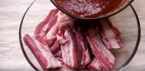 **Marinarea coastelor:** Luați aproximativ 1,2 kg de coaste de porc, turnați marinada pregătită peste ele și amestecați-le bine. Lăsați-le la marinat timp de 30 de minute, iar dacă aveți timp, chiar mai mult.