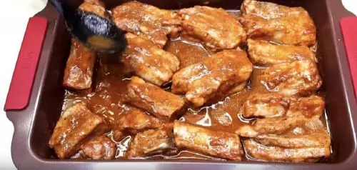 **Rumenirea:** Turnați sos peste coaste și puneți-le înapoi în cuptor pentru încă 30-40 de minute. În timpul coacerii, la fiecare 10-15 minute, turnați din nou sos peste coaste.