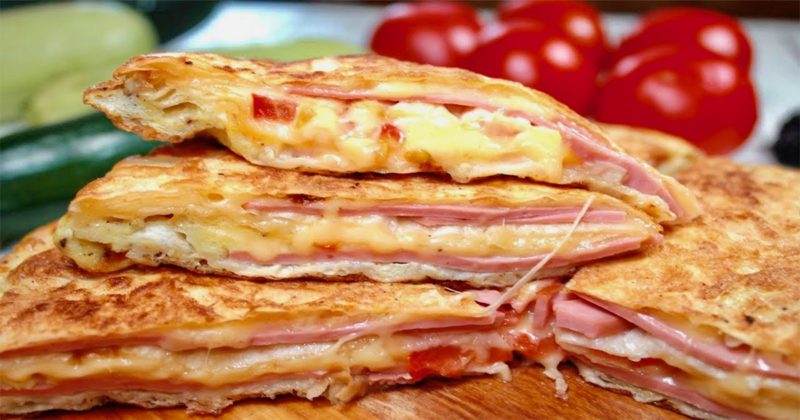 Așezăm și rondelele de roșii și le presărăm cu cașcaval, apoi le acoperim cu a treia lipie. Peste a treia lipie punem încă un strat de șuncă și cașcaval ras, apoi așezăm ultima lipie, peste care turnăm cantitatea rămasă de ou bătut. Acoperim tigaie cu capac și coacem la foc mic, 5 minute pe fiecare parte.
