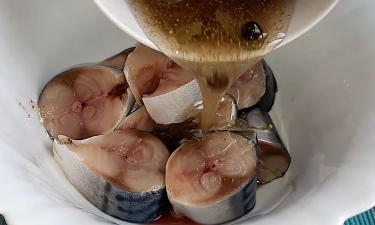 - Toarnă marinada peste pește, asigurându-te că fiecare bucată este bine acoperită.