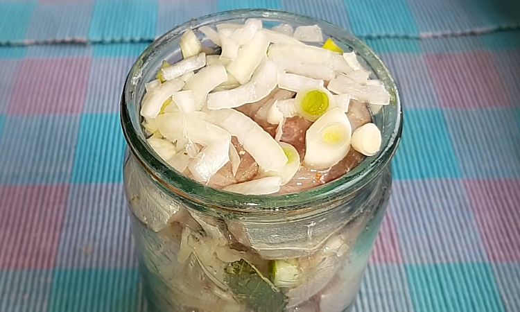 - Adaugă bucățile de macrou în straturi, alternând cu straturi de ceapă.