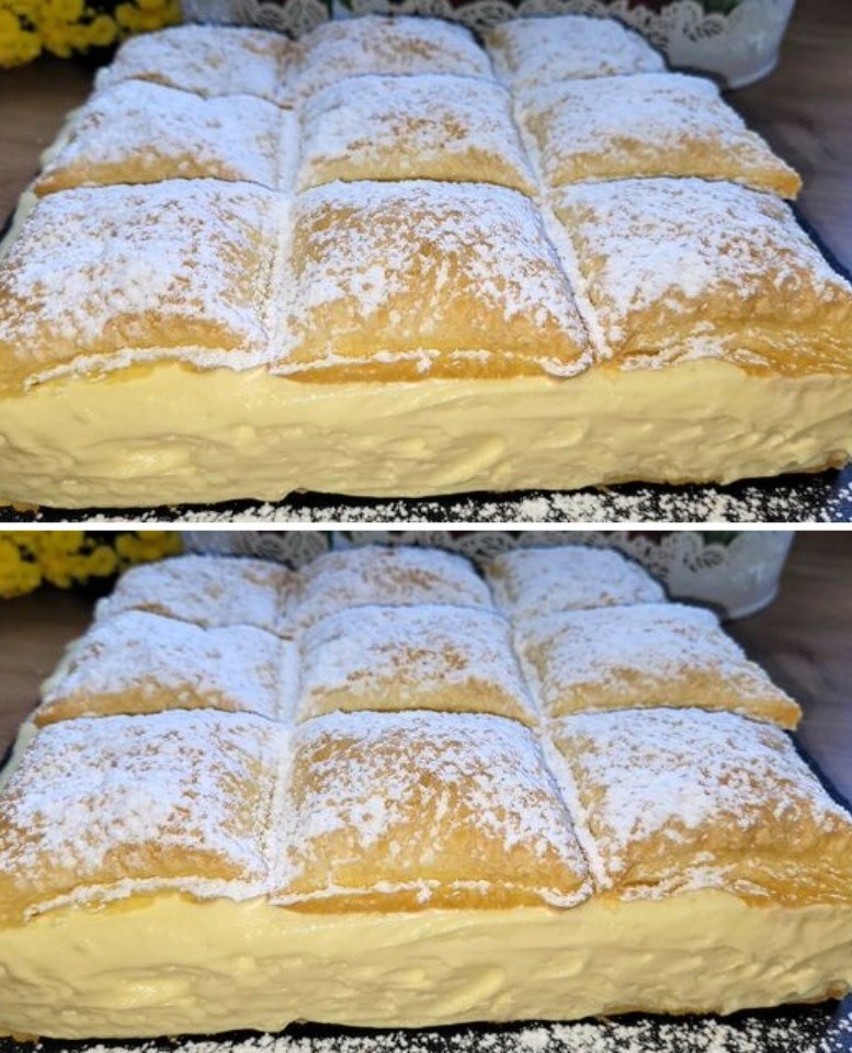 - Scoate desertul din tavă, îndepărtează folia, taie marginile pentru un aspect îngrijit și presară zahăr pudră deasupra.