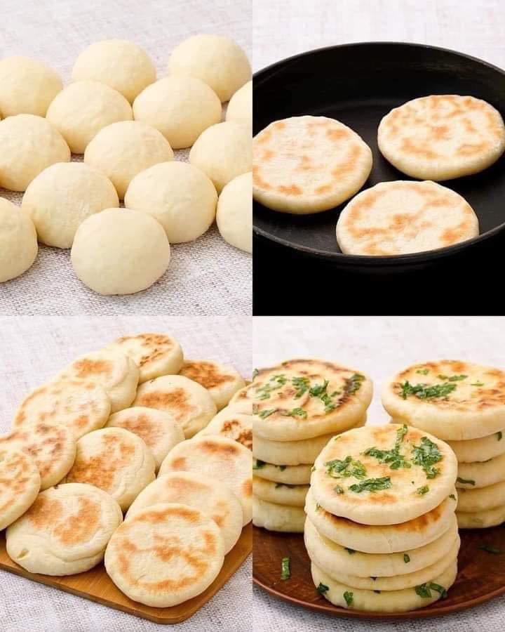 5. Întinde fiecare pâine și așează-o într-o tigaie preîncălzită la foc mediu-mare. Coace timp de 5-6 minute (2,5-3 minute pe fiecare parte). Când întorci fiecare pâine, aceasta trebuie să se umfle și să formeze un buzunar în mijloc.