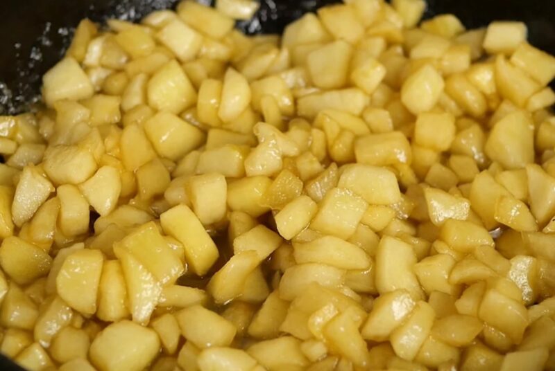 5. Încălzim o tigaie pe aragaz, punem zahărul și așteptăm să înceapă să se topească, apoi adăugăm untul și merele. Caramelizăm fructele până se evaporă lichidul.