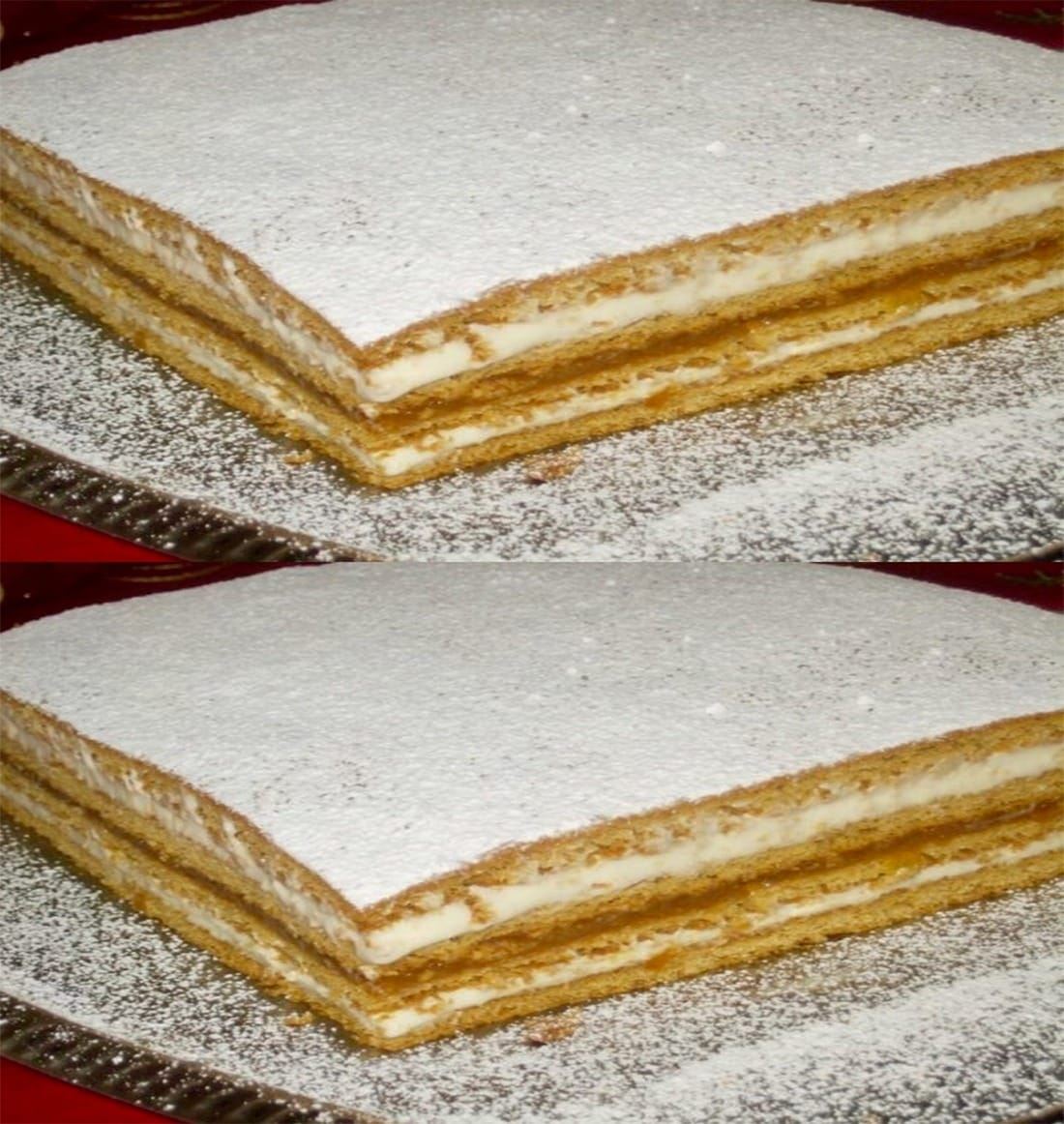 4. Finalizați cu ultima foaie, presărați zahăr pudră deasupra și lăsați prăjitura să stea 2-3 ore înainte de servire.
