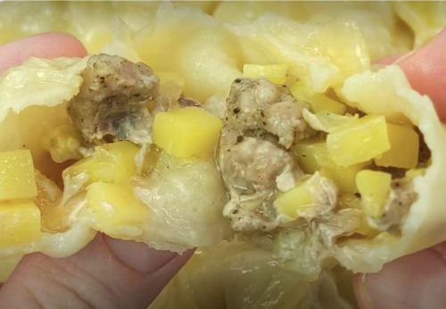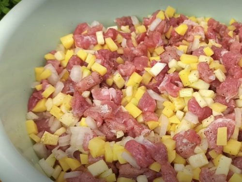 Ingrediente pentru umplutură: tocăm mărunt carnea, ceapa, cartofii și dovlecelul, le sărăm și amestecăm bine, obținând o umplutură suculentă pentru mantî.