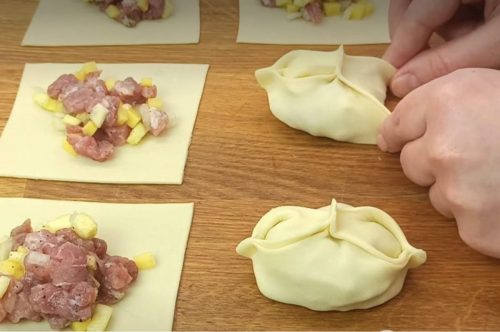 Punem o porție de umplutură în mijlocul fiecărui pătrat, unim cu grijă colțurile opuse și formăm mantî.