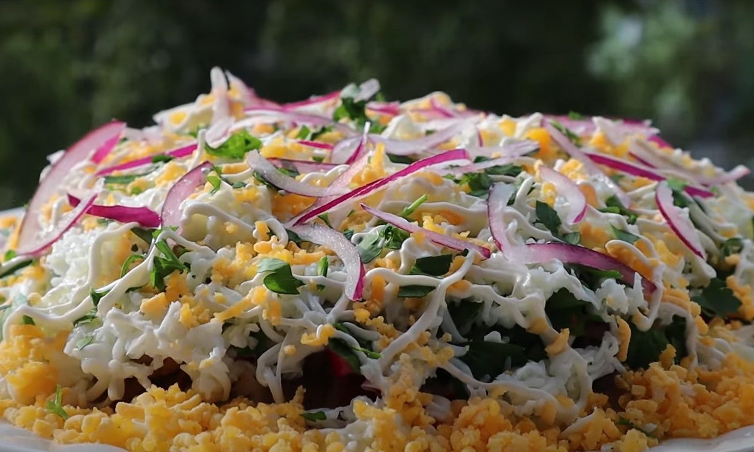 6. Adăugați ceapa marinată ca strat, acoperiți cu maioneză și presărați pătrunjel tocat deasupra.