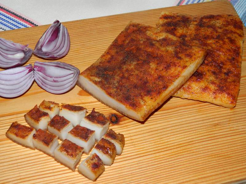 - Serviți slănina tăiată subțire, alături de ceapă roșie, pâine proaspătă și murături.