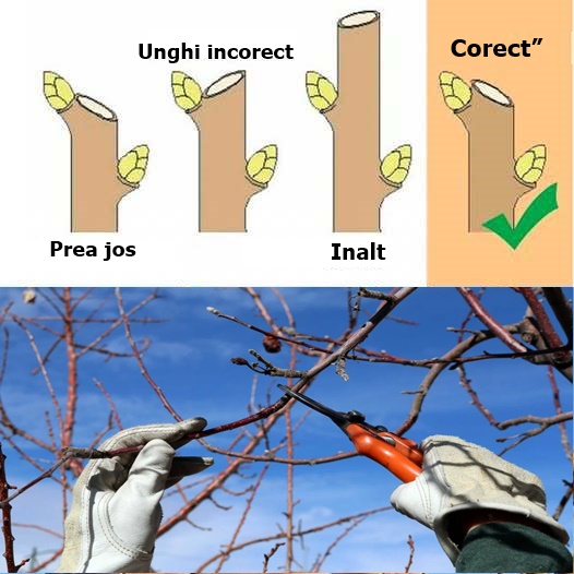 La scurtarea lăstarilor, tăierea se face la un unghi de 45° ușor deasupra mugurelui, pentru a nu-l deteriora.
