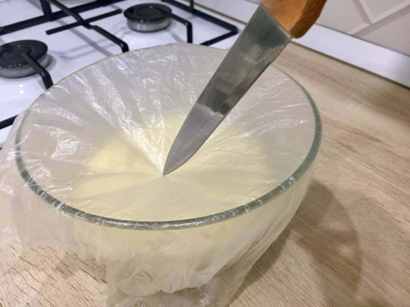 Acoperim vasul cu folie alimentară și facem 4–5 găuri în ea. Lăsăm aluatul să stea 15 minute.