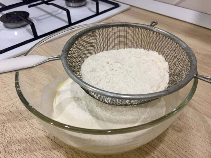 Adăugăm sarea și zahărul, punem făina și amestecăm bine. E mai bine să cântărim făina pentru a nu greși cantitatea.