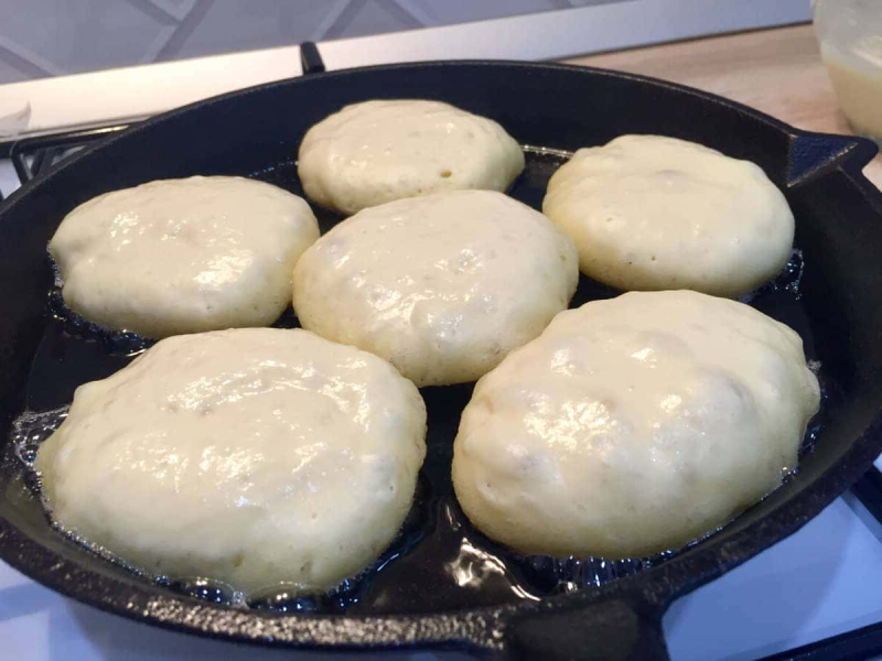 Luăm aluatul cu lingura de pe marginea bolului și îl punem în tigaie sub formă de turtițe, la distanță unele de altele. Coacem cu capac pe ambele părți (întoarcem când partea de sus devine mată).