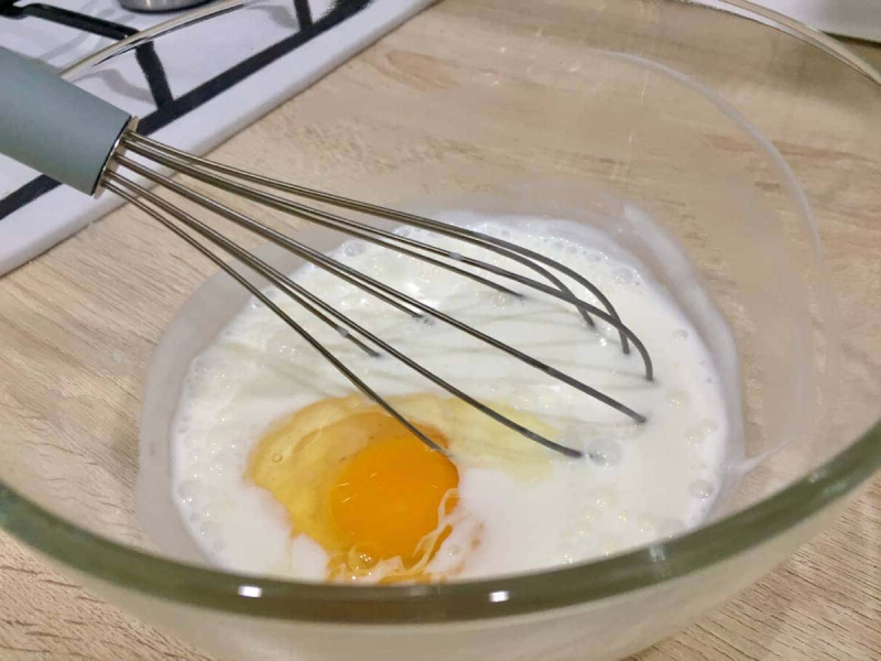 Turnăm chefirul într-un bol, spargem oul și amestecăm cu telul.