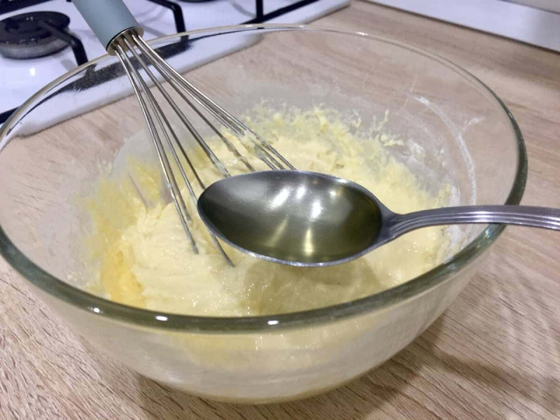 Turnăm uleiul și îl încorporăm bine. Aluatul va fi gros.