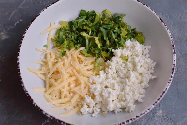 Între timp, pregătiți umplutura. Dați brânza tare pe răzătoarea mare, amestecați-o cu brânza proaspătă și adăugați verdeața tocată mărunt. Presărați amestecul cu sare și piper negru măcinat, apoi amestecați bine.